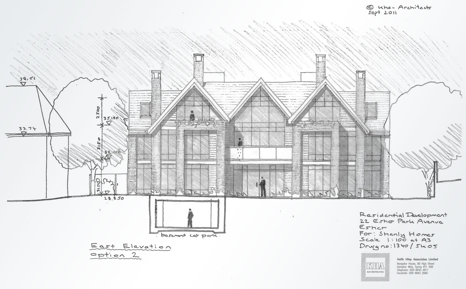 Sketch elevation (traditional option) for flats in Esher. Client: Michael Shanly Homes
